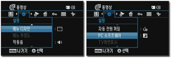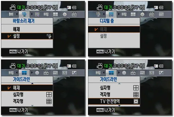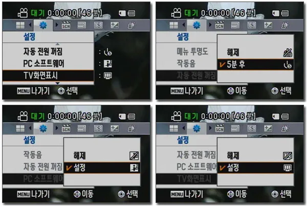 자동전원 꺼짐을 활성화 할 경우 5분간 아무런 조작이 없을 경우 자동으로 전원이 차단된다. 또한 테스트에서 자세히 설명드릴 빌트인 S/W 설정이 가능하며 TV 화면표시 (캠코더 LCD에 표시되는 각종 아이콘) 여부도 선택할 수 있다.