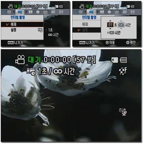 지정된 시간 간격 마다 정지영상을 기록하여 빠르게 재생 (1초에 30장 재생) 할 수 있는 인터벌 촬영을 지원하는 것이 인상적이다. 꽃이 피는 장면이나 하늘의 움직임 등을 관찰하는데 활용할 수 있다. (인터벌 촬영을 설정하면 상단의 사진과 같이 간격 및 기록시간 설정을 할 수 있다. 촬영간격은 1/3/5/10/15/30초 지정이 가능하며 24//72 시간 및 무한대로 촬영시간을 설정할 수 있다.)
