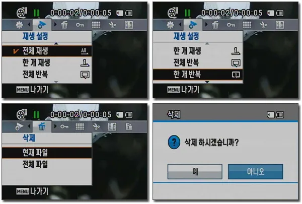재생관련 메뉴의 모습으로 재샐설정이 가능하며 촬영된 동영상 파일의 삭제 기능도 제공되는 것을 확인할 수 있다. (한 개의 파일 삭제 뿐만 아니라 전체파일 삭제도 지원하고 있다.)