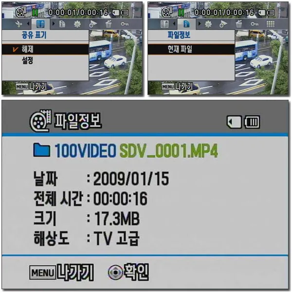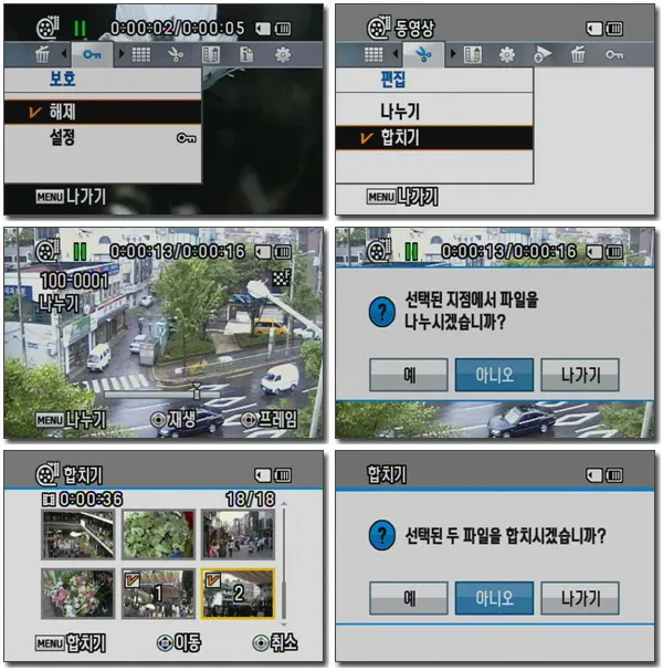 중요한 동영상 파일이 실수로 지워지지 않도록 보호 기능을 지원하며 촬영된 동영상 나누기 및 합치가 기능도 제공되는 것을 확인할 수 있다. (동영상을 재생 한 후 원하는 부분에서 멈추고 자를 수 있으며 2개의 동영상 파일을 선택하여 합칠 수 있다.)