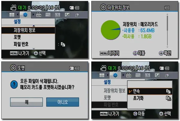 이번에는 기기의 전체적인 기능을 설정하는 환경설정 메뉴를 알아보도록 하자. 저장위치 (외장 메모리) 의 사용정보를 확인할 수 있으며 메모리의 포맷 기능이 제공된다. 또한 파일번호 의 설정도 지원하는 것을 알 수 있다.