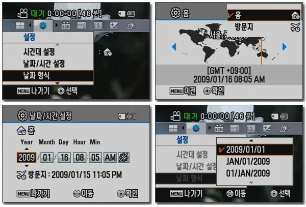 홈 뿐만 아니라 방문지의 시간대 설정 및 날짜 시간 설정이 가능하며 날짜 형식을 선택할 수 있다.
