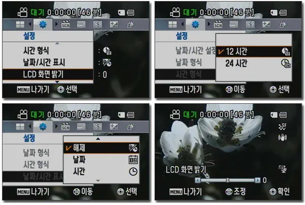 날짜 뿐만 아니라 시간형식도 지정할 수 있으며 날짜 및 시간표시 여부를 선택할 수 있다. 또한 LCD 화면의 밝기도 자유롭게 조정할 수 있다.