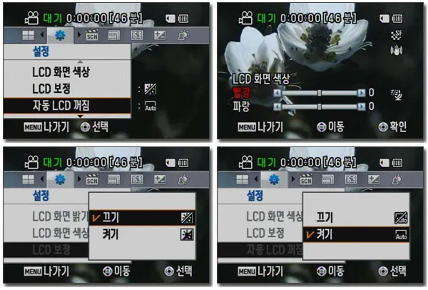 화면 밝기 뿐만 아니라 컬러 설정도 지원하며 야외에서 시인성을 높일 수 있도록 LCD 보정 기능도 제공되는 것을 확인할 수 있다. 또한 자동 LCD 꺼짐 기능을 지원하여 배터리를 보다 효율적으로 사용할 수 있다.