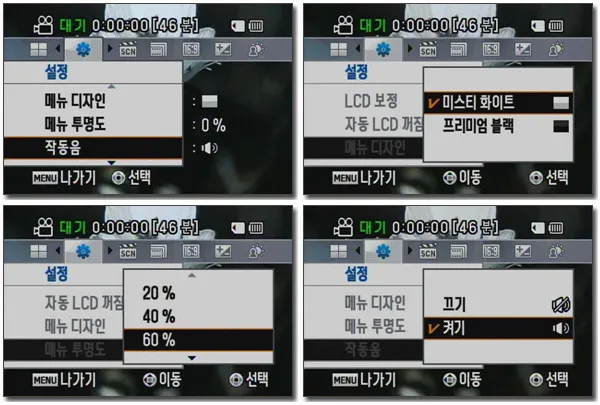 2개의 메뉴 디자인을 지원하며 메뉴의 투명도 설정도 지원하는 것을 확인할 수 있다. 또한 작동음 선택도 가능하다.