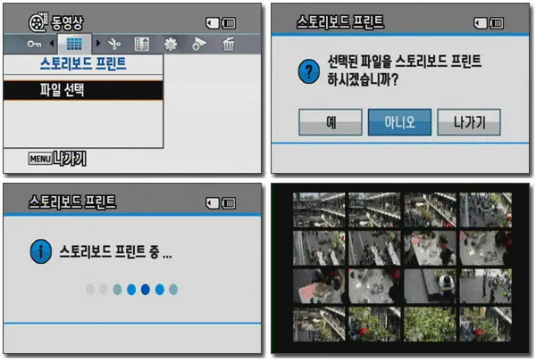 SMX-C10 은 스토리보드 프린팅 이라는 색다른 기능을 지원하고 있다. 재생설정 메뉴에 있는 '스토리보드 프린트' 를 선택 한 후 파일은 고르면 DCIM 폴더에 1600 x 1200 해상도의 사진 파일이 생성된다. 촬영된 동영상을 시간별로 16분할하여 썸네일을 표시해 주어 촬영된 영상의 내용을 보다 빠르고 직관적으로 확인할 수 있는 기능이라 할 수 있다.