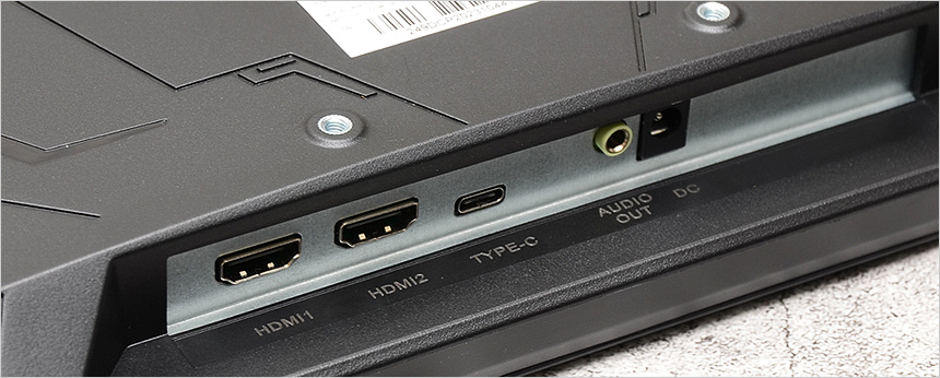 하단 중앙에는 75mm 베사홀이 설치되어 벽에 걸거나 ARM 등에 장착해 사용할 수 있으며 하단에는 2개의 HDMI 단자와 C타입 단자를 지원해 PC와 노트북, 게임콘솔, 스마트폰 등과 손쉽게 연결해 사용할 수 있다.