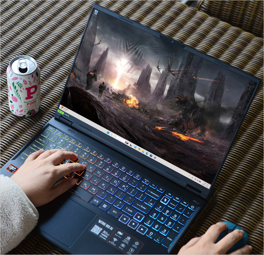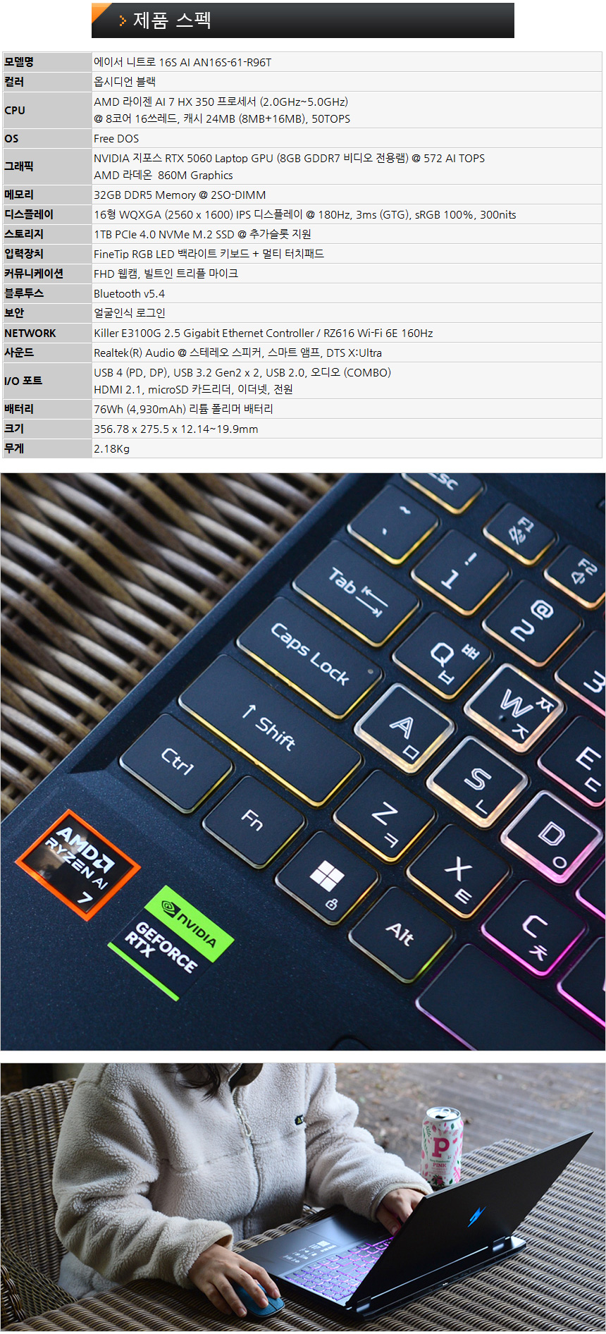 이번에 리뷰를 진행 할 에이서 니트로 16S AI AN16S-61-R96T 는 게임, 작업, 학습, AI 등 다용도로 활용할 수 있는 고급형 노트북을 찾고 있는 유저들에게 적합한 모델로 AMD 라이젠 AI 7 HX 350 프로세서 와 32GB 대용량 메모리, RTX 5060 랩탑 GPU 탑재로 최신 게임을 상위 옵션에서 부드럽게 플레이 할 수 있으며 생성형 AI 작업용으로도 손색이 없다. 뿐만 아니라 16형 대화면에 WQXGA 고해상도를 지원하는 180Hz 디스플레이가 탑재되어 게임은 물론 작업용으로도 편하게 사용할 수 있다.