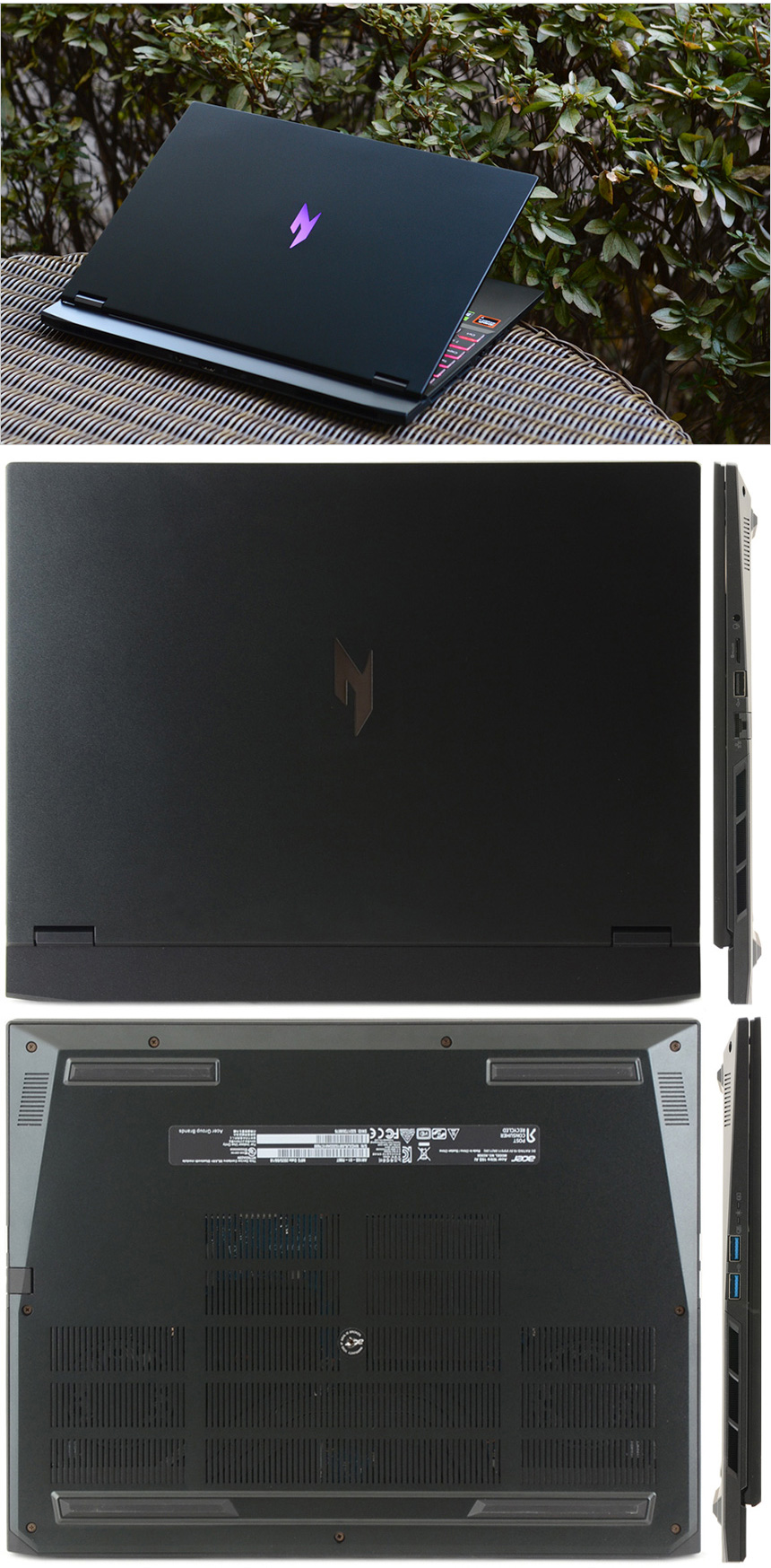 노트북의 디자인은 고급형 모델답게 깔끔하고 세련된 것을 확인할 수 있다. 상판의 니트로 로고와 키보드에 RGB LED를 적용해 포인트를 주었으며 일부 보급형 노트북과 확연하게 비교되는 높은 마감완성도를 자랑한다. 중후하고 강렬한 올 블랙 컬러에 메탈 소재를 사용해 내구성을 높인 제품으로 지나치게 화려하지 않아 사무실 등에서도 이질감 없이 사용할 수 있다.