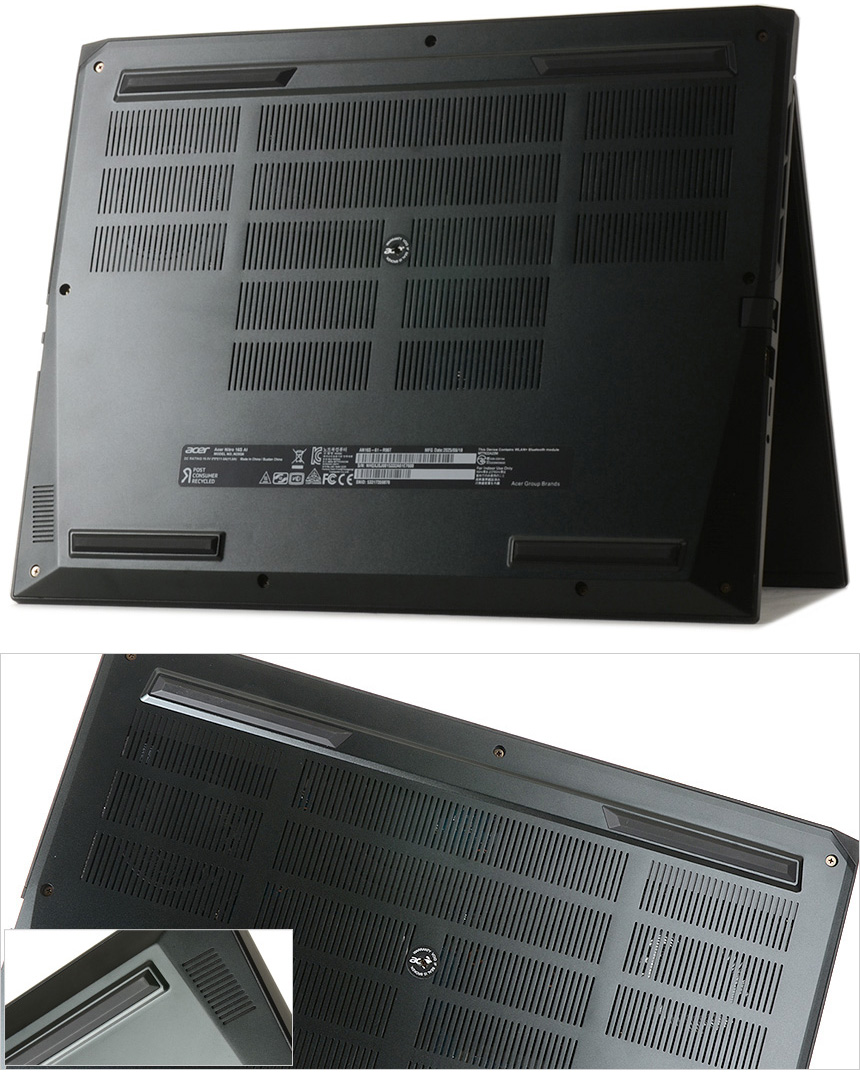 노트북 바닥면의 모습으로 차가운 공기가 원활하게 내부로 유입될 수 있도록 상단에 통풍구가 설치되어 있으며 사방에는 미끄러짐 방지를 위해 두꺼운 고무패드가 부착되어 있다. 또한 하단 양 측면에는 스피커가 설치되어 퀄리티 높은 사운드를 즐길 수 있다.