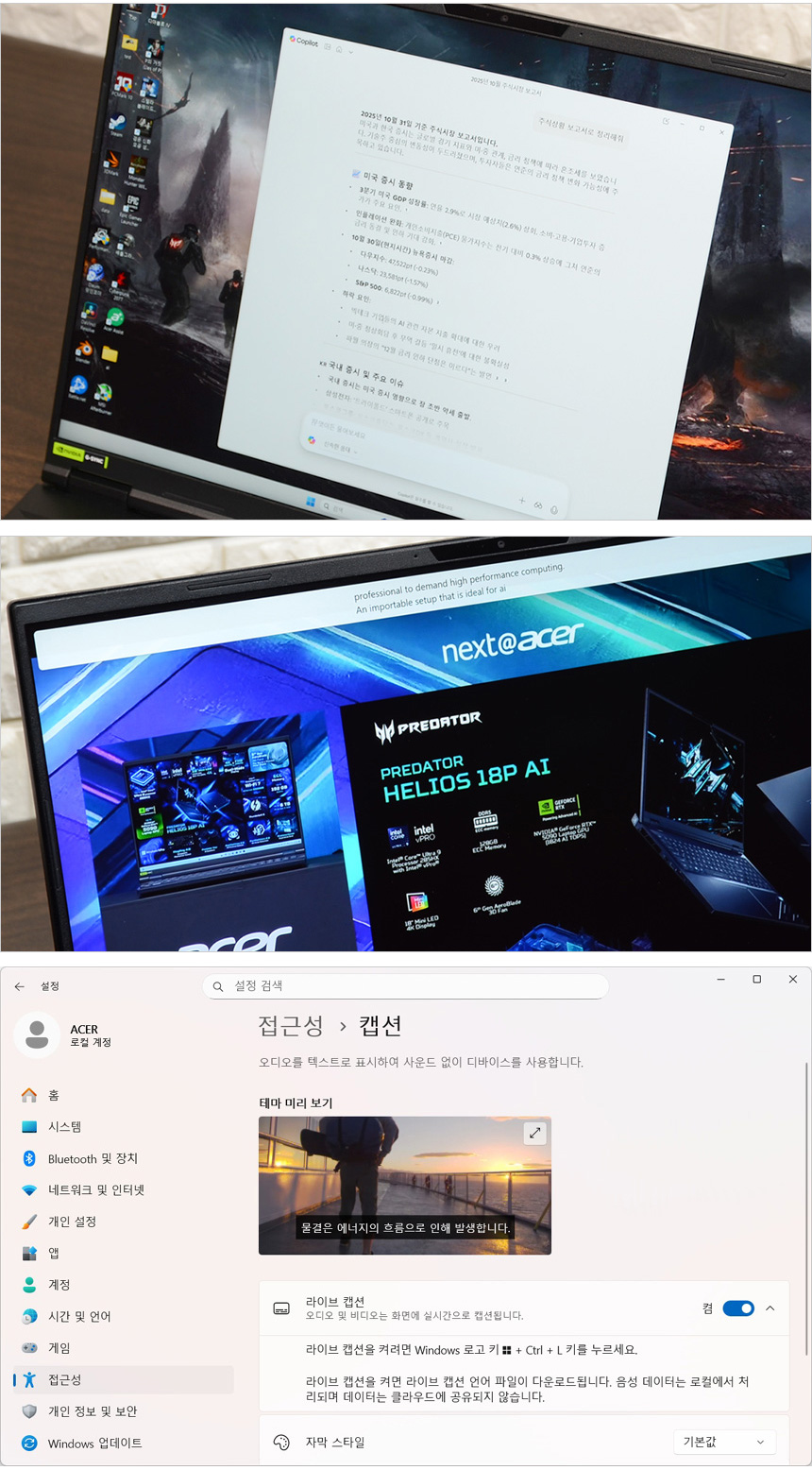 기본 지원하는 코파일럿을 실행한 모습으로 손쉽게 보고서를 만들 수 있었다. (업무용으로 유용하게 활용하고 있다. AI를 쉽게 체감하고 싶다면 코파일럿부터 사용해 보기 바란다.) 또한 AI 가 음성을 텍스트로 변환해 주는 라이브 캡션 기능을 사용할 수 있다. 한국어를 포함한 다양한 언어의 오디오 자막을 텍스트로 표시해 주어 사무실 등에서 스피커나 이어폰을 사용하기 힘들 경우나 화상회의 에서 적극적으로 사용하기 바란다.