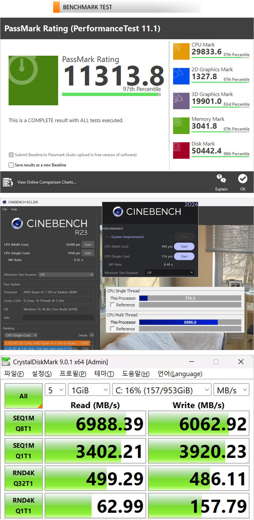 벤치마크 프로그램을 이용해 성능 테스트를 진행하고 있는 모습으로 CPU 성능이 상당히 뛰어난 것을 확인할 수 있었다. 최신 게임은 물론 대부분의 작업을 부드럽게 실행할 수 있을 것이다. 또한 저장장치의 속도를 확인해 보았는데 PCIe Gen4 SSD가 기본 장착되어 6000MB/s 이상의 빠른 읽기 속도를 지원하는 것을 확인할 수 있다. 특히 1TB 대용량을 지원해 100GB를 훌쩍 넘어가는 최신 게임을 편하게 설치할 수 있다.