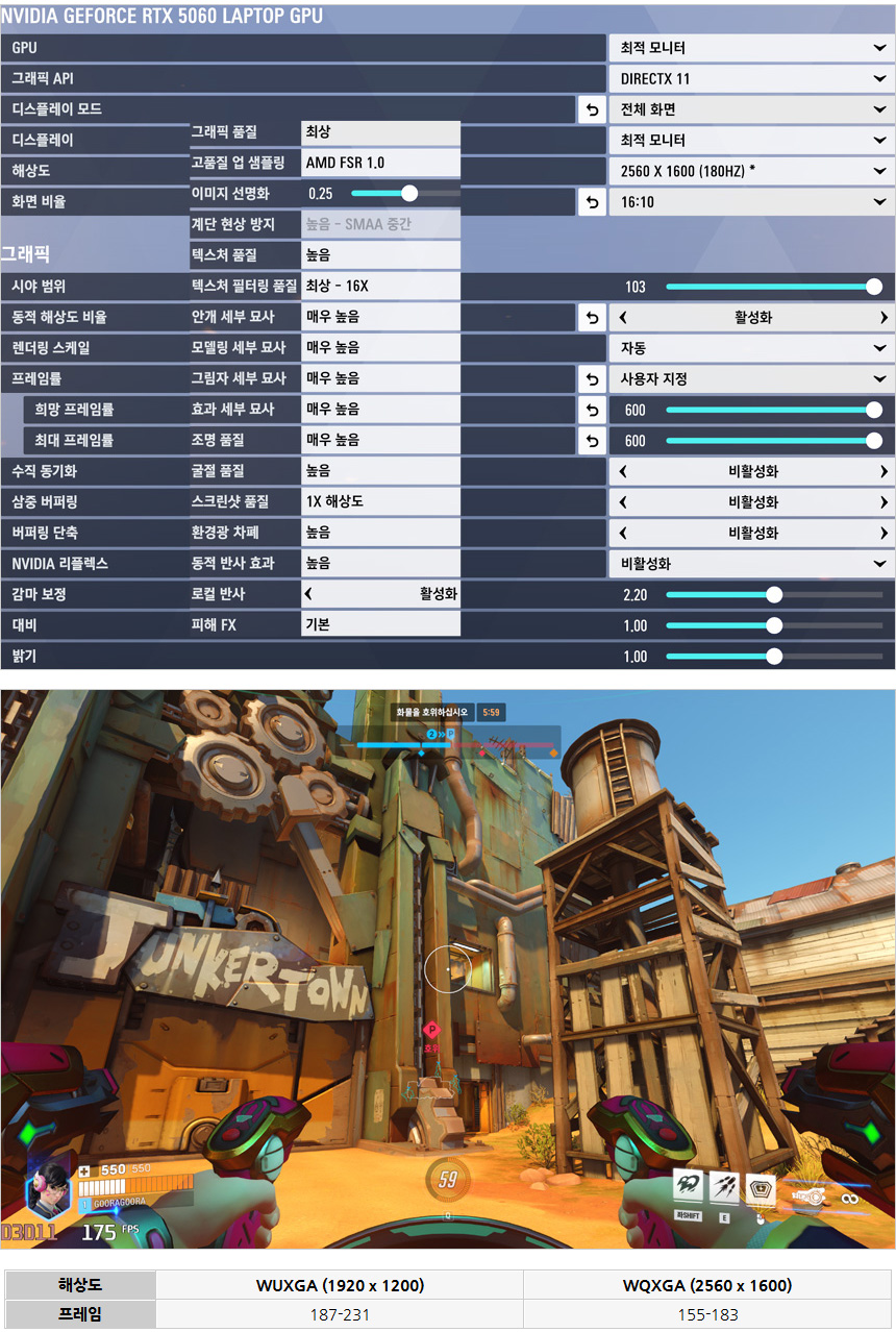 오버워치2를 이용해 게임 테스트를 진행하고 있는 모습으로 최상 옵션을 설정했을 때 WQXGA 해상도 에서도 100프레임 중반대로 게임이 가능하다. 옵션을 낮춰 프레임을 최대로 확보하면 180Hz 주사율을 충분히 활용할 수 있을 것이다.