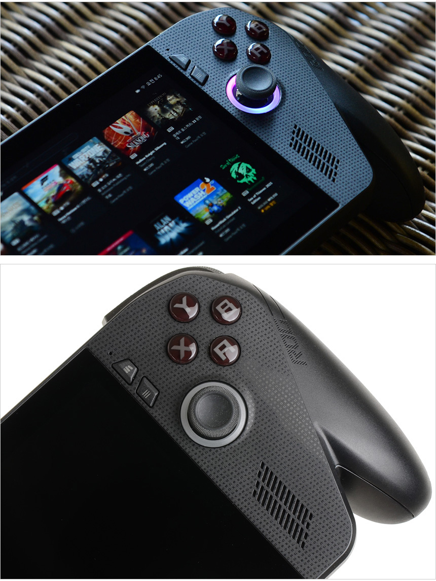 전면 우측면의 모습으로 ABXY 버튼을 비롯해 조이스틱이 설치된 것을 확인할 수 있다. 조이스틱 테두리에 RGB LED를 지원해 디자인 만족감을 높였으며 라이브러리 버튼과 메뉴 버튼을 지원해 편하게 게임을 선택하거나 기기를 조작할 수 있다. 또한 마이크가 설치되어 있고 하단에는 돌비 애트모스를 지원하는 스피커가 장착되어 퀄리티 높은 입체음향을 즐길 수 있다.