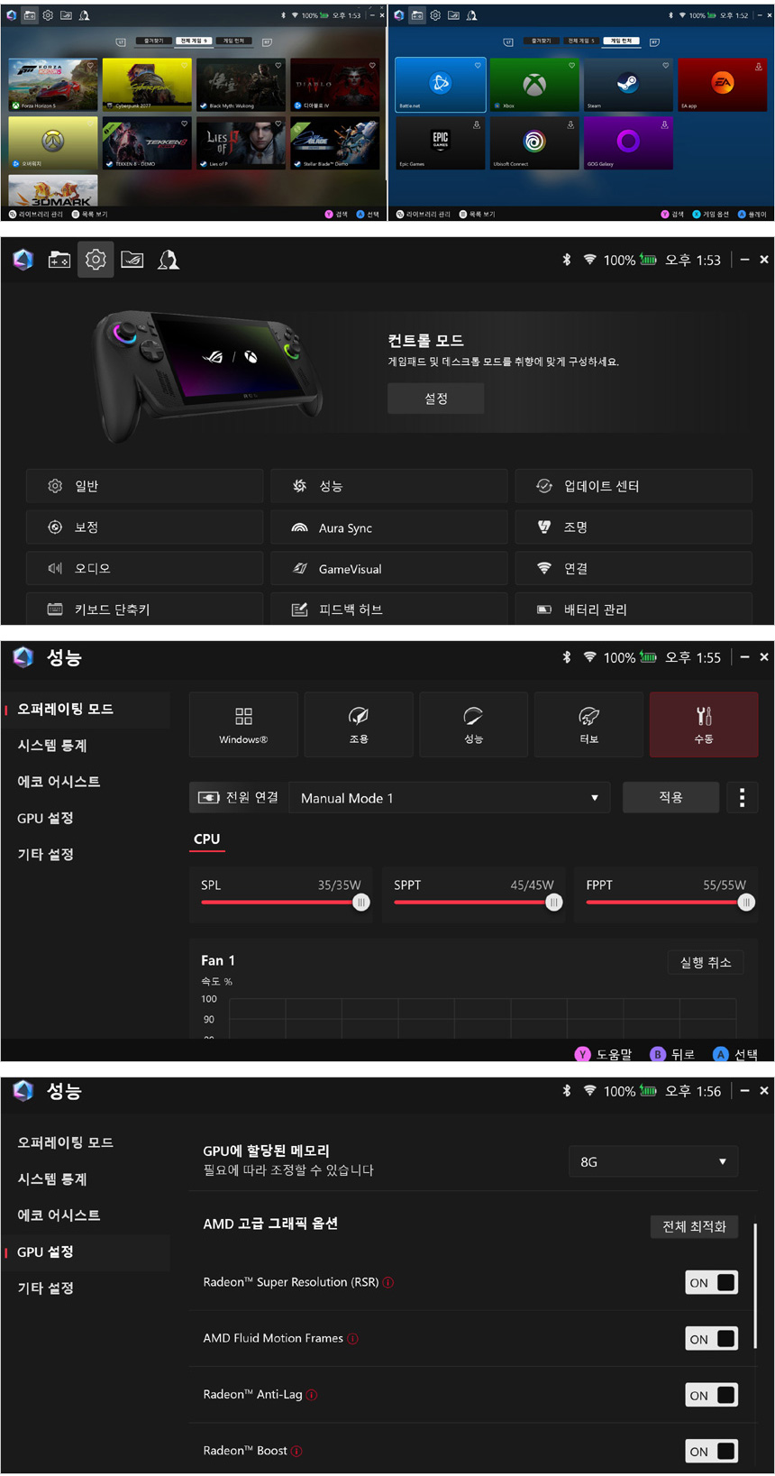 Armoury Crate SE를 실행한 모습으로 라이브러리를 지원해 설치한 게임을 손쉽게 선택할 수 있고 다양한 게임 플랫폼이 별도로 표시되어 많은 게임이 설치되었을 때 손쉽게 파악할 수 있다. 또한 퍼포먼스를 사용자가 원하는 대로 설정할 수 있으며 수동모드도 지원한다. 뿐만 아니라 프레임을 높일 수 있는 AMD의 고급 그래픽 옵션 조정도 가능한 것을 확인할 수 있다.
