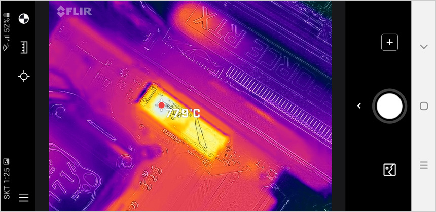 쉴드프로저를 제공해 SSD의 스로틀링 현상을 방지할 수 있다. 상단의 사진은 열이 많은 PCIe 4.0 NVMe SSD의 표면온도를 확인하고 있는 모습으로 (크리스탈 디스크마크 읽기/쓰기 3회 실행후 온도) SSD 만 장착되어 있을 때 표면 온도가 70도 후반까지 올라가는데 반해 히트싱크를 장착하면 표면 온도가 대폭 낮아지는 것을 확인할 수 있었다.