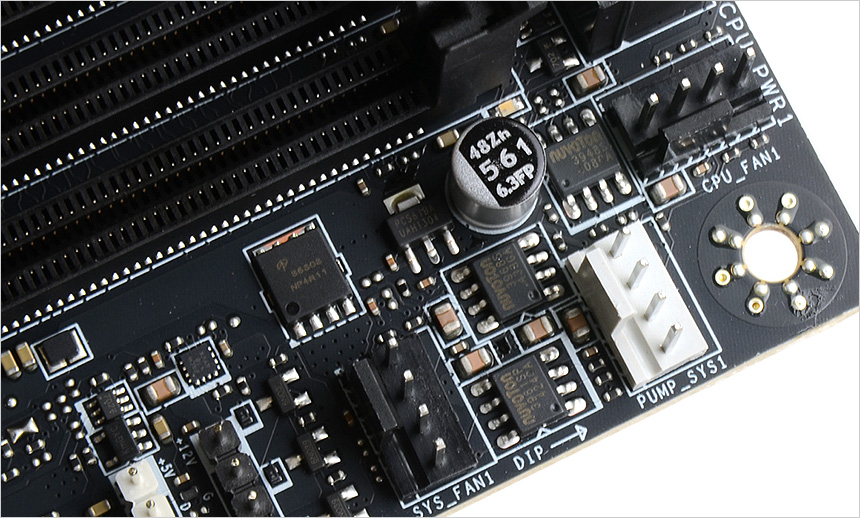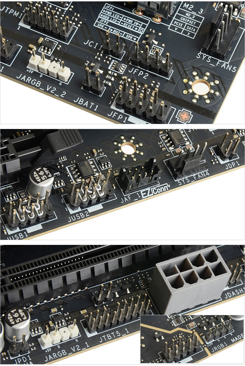 총 5개의 시스템 팬 단자를 지원해 다량의 팬을 연결해 시스템의 열을 식혀줄 수 있으며 오디오 핀 헤더도 설치된 것도 알 수 있다. 뿐만 아니라 미스틱 라이트 활용을 위한 RGB 핀 헤더, 2개의 USB 2.0 핀헤더를 제공하며 PCIe 전원 커넥터가 추가되어 하이엔드 급의 그래픽카드에 넉넉하게 전원을 공급할 수 있으며 1 to 3 EZ 케넉터 케이블과 전용 단자를 지원해 수냉쿨러나 쿨링팬 연결시 보다 쉽게 설치할 수 있다.