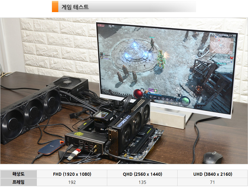 테스트를 위해 시스템을 구성한 모습으로 인텔코어 울트라 7 265K 프로세서를 사용했으며 7000MB/s 의 빠른 속도를 보여주는 SK하이닉스 P41을 비롯해 넉넉한 전원 공급을 위해 MSI MAG A850GLS 80PLUS GOLD와 XMP를 지원하는 오버클럭 메모리 마이크론 크루셜 DDR5 6000MHz CL36 PRO를 장착했다. (튜닝 메모리 구입후 XMP를 적용해 사용할 수 있으며 메모리 오버클럭을 통해 기본 메모리의 성능을 높일 수 있다.) 또한 RTX 3070 Ti 그래픽카드와 수랭쿨러 MSI MEG 코어리퀴드 S360을 장착했다.