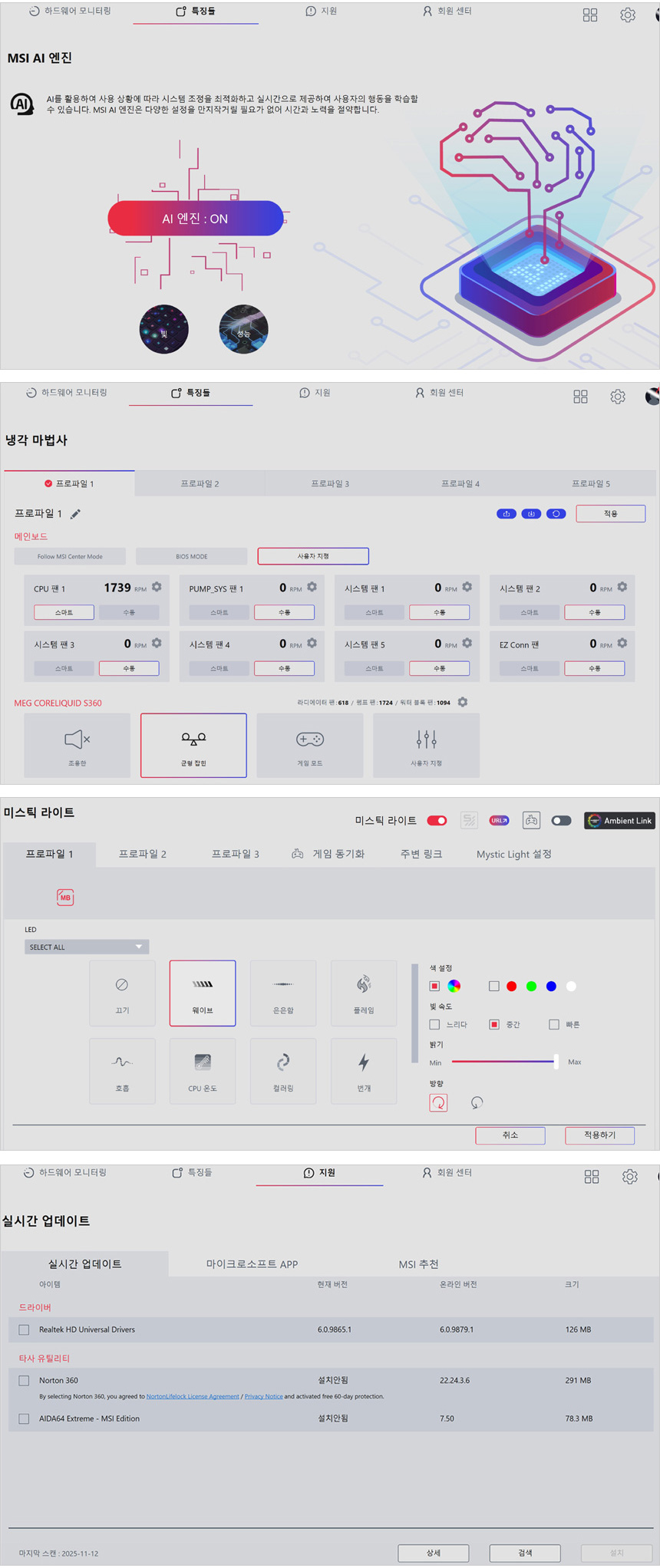 자동으로 시스템을 최적화 하는 AI 엔진을 제공하고 냉각마법사를 통해 팬속도 등을 조절할 수 있다. (MSI 그래픽카드를 사용하면 제로프로져와 쿨러부스트 설정도 가능하다.) 또한 미스틱 라이트 지원으로 조명 동기화가 가능하며 업데이트를 지원해 최상의 컨디션으로 PC를 사용할 수 있다.