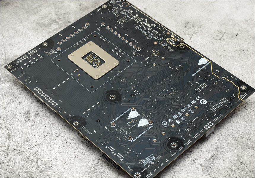 메인보드 바닥면의 모습으로 깔끔하게 디자인된 것을 확인할 수 있다. 특히 스탠드 오프나 기타 이물질과 잦은 접촉으로 인한 메인보드 고장을 미연에 방지하도록 Aviod Collision Zone을 적용한 것이 눈에 띈다.