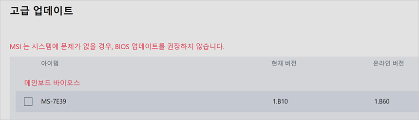 최신 바이오스로 업데이트 하고 있는 모습으로 바이오스의 M-FLASH 메뉴로 들어가면 쉽게 진행할 수 있다. (초보자도 할 수 있을만큼 쉽다.) 이 제품은 고급형 모델답게 바이오스 초기화와 업데이트 버튼이 제공되어 바이오스에 진입하고 않고 간단하게 업데이트를 할 수 있다. @ 최신 바이오스는 MSI 홈페이지에서 다운로드 받을 수 있다.