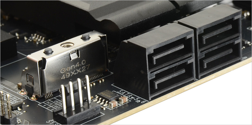 PC 케이스에서 C타입의 USB 3.2 Gen2 사용을 위한 JUSBC1 커넥터를 제공하며 JUSB1 (USB 3.2 Gen1) 커넥터가 설치된 것도 눈에 띈다. 또한 4개의 SATA 단자를 지원해 HDD를 손쉽게 장착해 저장 용량을 늘릴 수 있다.