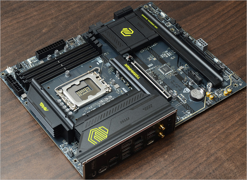 또한 S/PDIF를 포함한 오디오 단자가 설치되어 있고 5G 이더넷 단자와 Wi-Fi 7 무선랜 사용을 위한 2개의 안테나 단자가 설치되어 있는것도 눈에 띈다. (볼트를 돌려주어야 했던 예전과 달리 밀어주면 자동 장착되도록 설계해 편의성을 높였다.) 내장그래픽 사용자를 위해 HDMI 2.1 단자와 DP 단자를 제공하며 5개의 USB 3.2 Gen2 단자 (C타입 포함) 와 4개의 USB 2.0 단자 지원으로 여유롭게 주변기기를 연결할 수 있다.