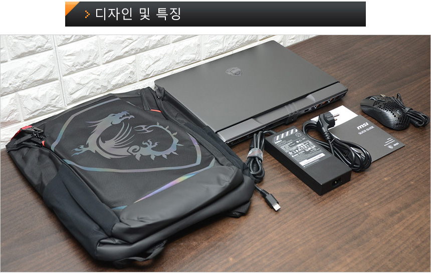 풀KIT 의 모습으로 본체를 비롯해 330W 전원 어댑터와 전원 케이블, 퀵 매뉴얼, 보증서 등이 제공되며 전용 백팩과 게이밍 마우스를 지원한다.