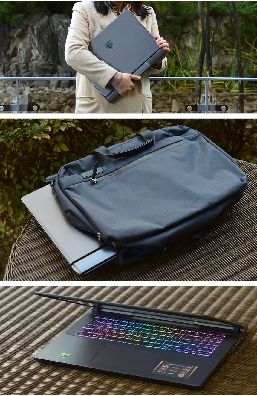 380.34 x 297.97 x 22.85~28.75mm 의 크기와 3Kg 의 무게를 지원한다. 데스크탑PC를 대체하는 용도로 적합한 모델이지만 무게가 3Kg 으로 비교적 가벼운 편이며 (스펙대비) 전용 백팩을 제공해 출장이나 파견 등으로 외부에서 고성능 노트북을 사용해야 하는 유저들은 불편없이 사용할 수 있다. (촬영 때문에 며칠 들고 다녔는데 크게 부담스럽지 않았다.)