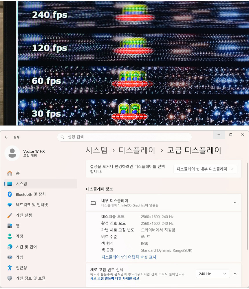 120Hz 나 144 Hz 주사율을 지원하는 일반 게이밍 노트북과 달리 QHD+ 고해상도 임에도 240Hz 의 높은 주사율을 지원해 빠른 캐릭터 움직임을 정확히 확인해야 하는 FPS 게임을 만족스럽게 즐길 수 있다. 상단의 사진은 하위 프레임과 같이 재생되는 영상 (960 Pixel Per Sec) 을 셔터스피드 1/20 로 촬영한 모습으로 프레임이 낮을수록 캐릭터의 수가 적으며 프레임이 높아질수록 시간당 많은 화면이 뿌려지기 때문에 캐릭터의 수가 많은 것을 확인할 수 있다.