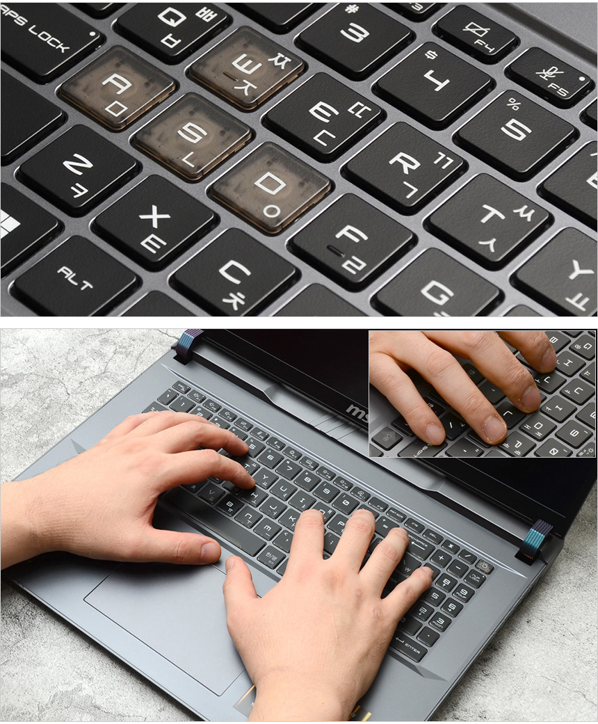 키보드의 모습으로 17형 대화면을 지원하는 노트북 답게 텐키를 포함한 풀사이즈 치클릿 키보드를 장착했다. 24존 RGB 키보드가 장착되어 화려한 조명 효과를 즐길 수 있으며 S/W를 통해 컬러나 효과를 사용자에 맞게 설정할 수 있다. (WASD와 방향키의 주목성을 높인점도 무척 마음에 든다.)
