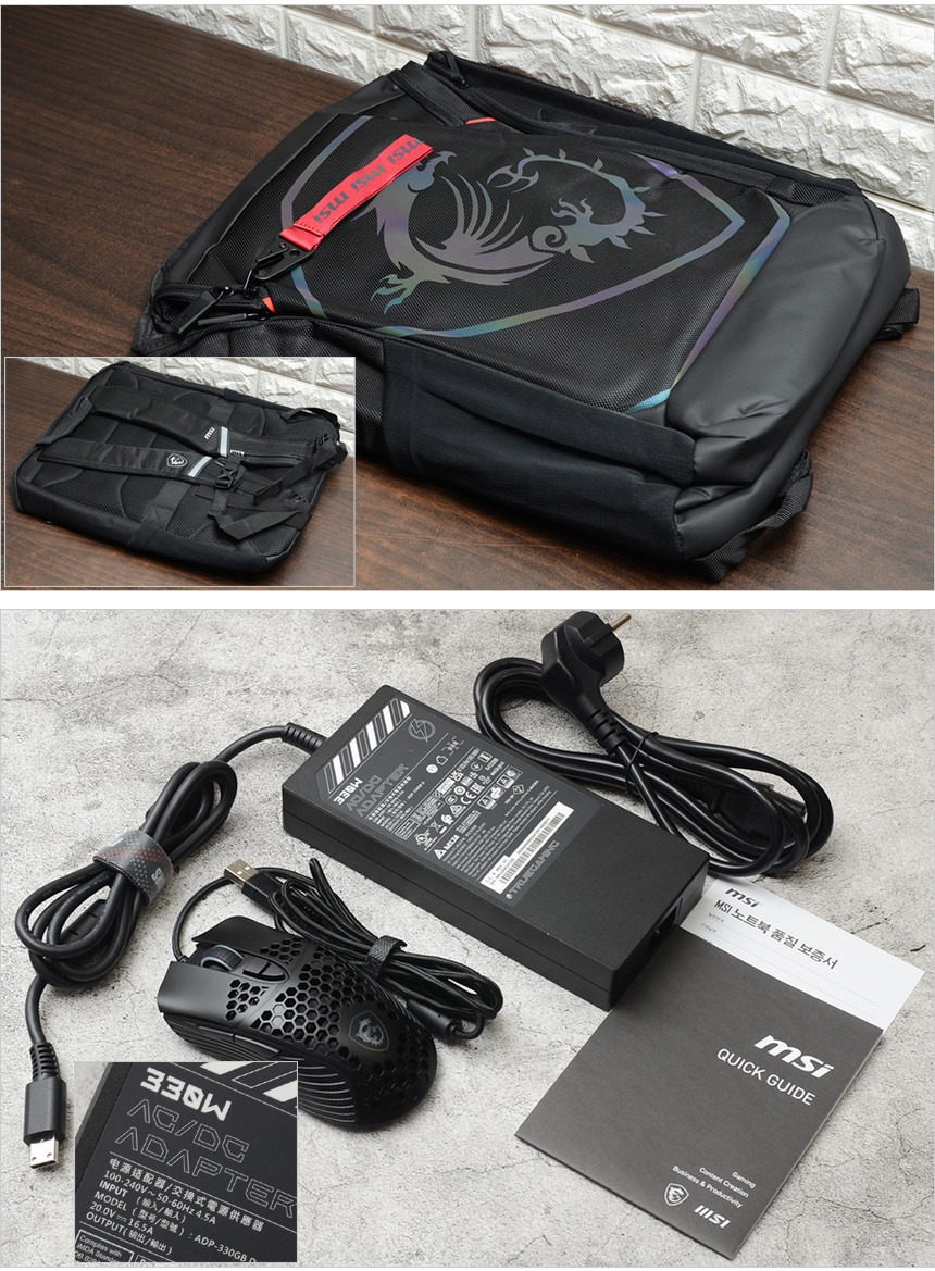 액세서리의 모습으로 330W 전원 어댑터와 전원 케이블, 퀵 매뉴얼, 보증서가 포함되어 있고 게이밍 마우스와 전용 백팩을 지원하는 것을 확인할 수 있다.