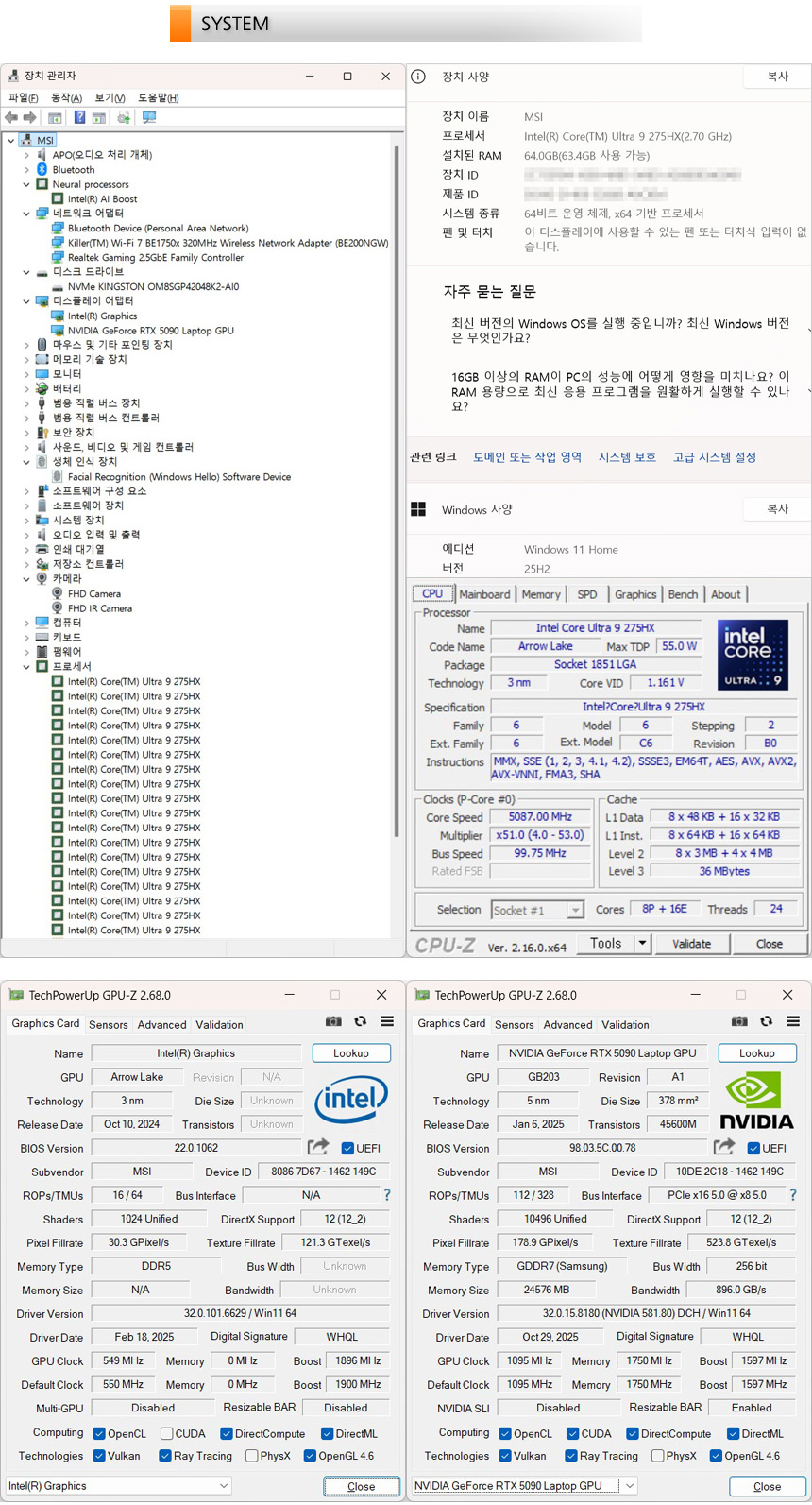 시스템 정보를 확인하고 있는 모습으로 8+16코어에 36MB 캐시가 내장된 최상급 모바일 프로세서 인텔코어 울트라 9 275HX 가 장착된 것을 확인할 수 있으며 RTX 5090 랩탑 GPU와 64GB DDR5 듀얼채널 메모리를 지원한다. 또한 2TB PCIe 4.0 NVMe SSD를 지원해 대용량 게임이나 데이터 설치 및 저장이 용이하다. (RTX 5090 랩탑 GPU는 24MB의 비디오 전용램을 지원하며 1597MHz 부스트 클럭으로 작동한다.)
