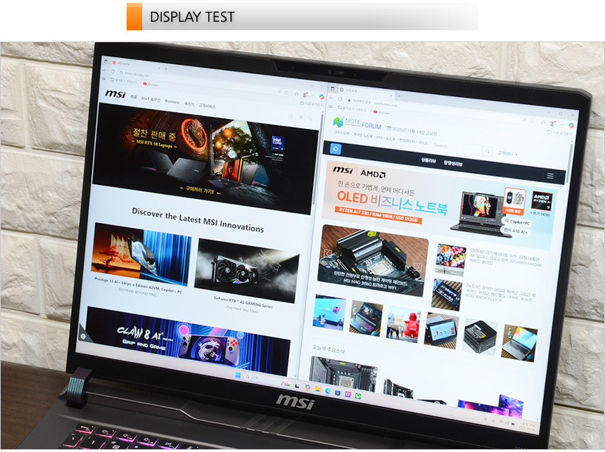 OLED가 부럽지 않는 고선명 디스플레이 탑재도 칭찬하고 싶다. 사진이나 동영상을 보면 감탄사가 나올만큼 뛰어난 선명도를 보여 주었으며 디테일이나 밝기 등에서도 흠잡을 때 없는 모습을 보여주었다. (일반 노트북에서 사용하는 OLED 보다 만족감이 훨씬 컷다.) 특히 240Hz 의 높은 주사율을 지원해 FPS 게임을 플레이 할 때 움직임 자체가 달라 더 편하게 게임을 즐길 수 있었다.