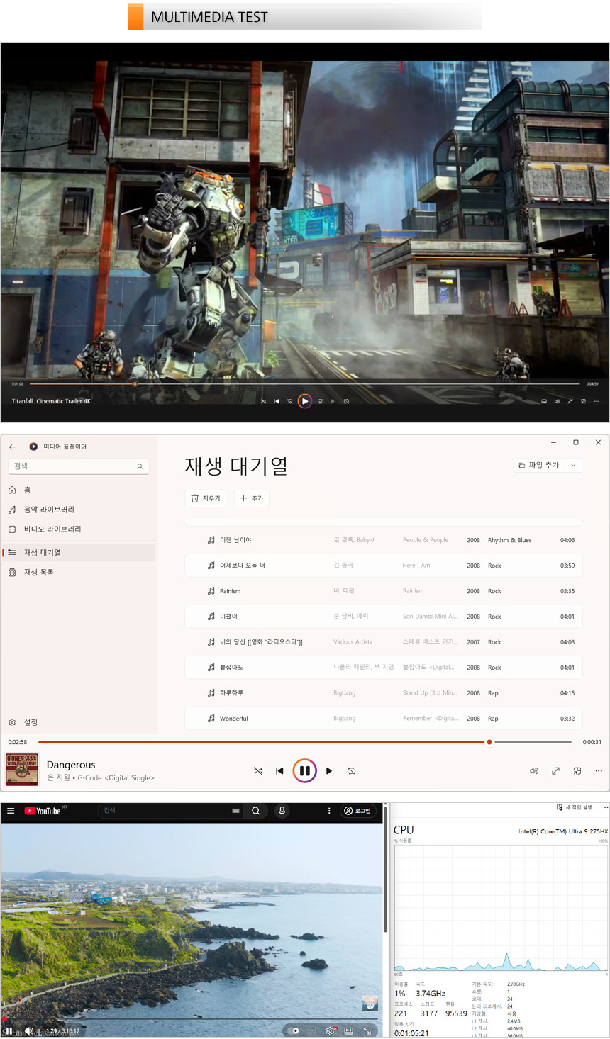 또한 유튜브 고화질 동영상을 이용해 CPU 점유율을 테스트해 보았는데 (2160P@60FPS) 1-10% 대의 점유율을 보여 주었으며 인터넷을 실행했을 때 10% 초반까지 점유율이 올라가는 것을 확인할 수 있었다.