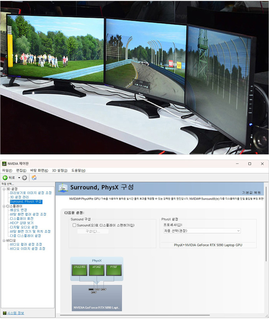 3개의 모니터 연결이 가능해 멀티 모니터가 하나의 영상을 재생하는 서라운드 기술을 사용할 수 있다. (서라운드 기술 활용시 동일 모니터 사용을 권장한다.) 축구나 레이싱 게임시 유용하게 활용할 수 있을 것이다. @ 서라운드 기능 활용시 동일 모니터를 사용하기 바란다.