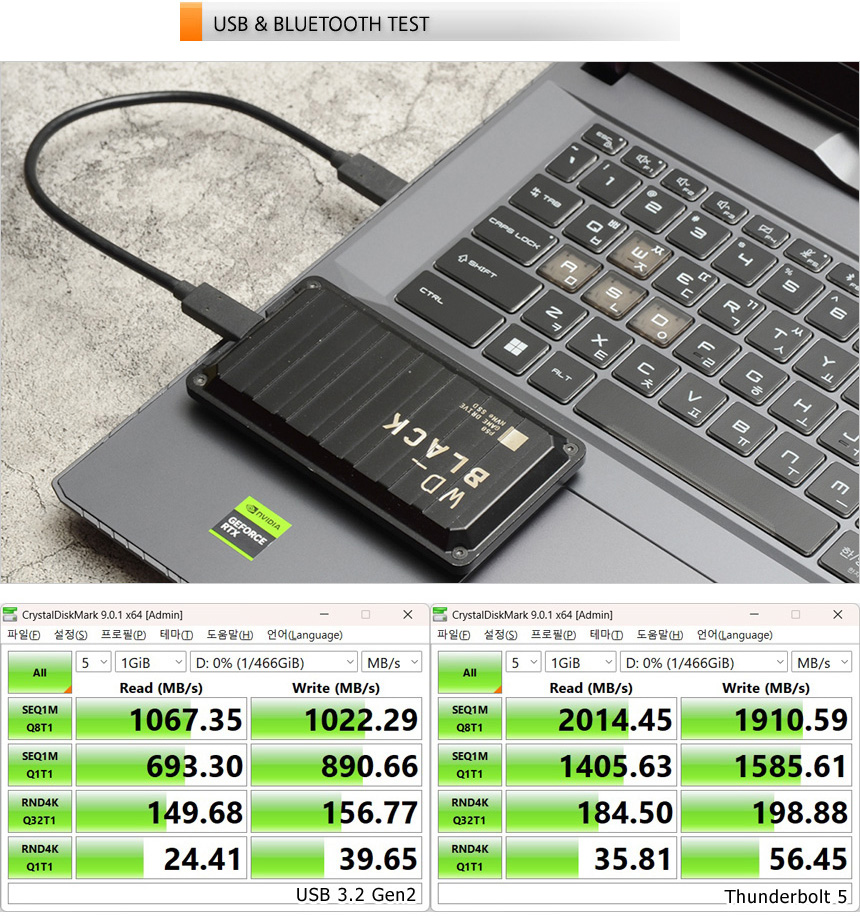 2개의 썬더볼트 5 단자를 지원해 초고속 데이터 전송이 가능하다. 상단의 사진은 USB 3.2 Gen2x2 외장 SSD를 이용해 USB 3.2 Gen2 단자와 속도를 비교한 모습으로 속도차가 큰 것을 확인할 수 있었다.