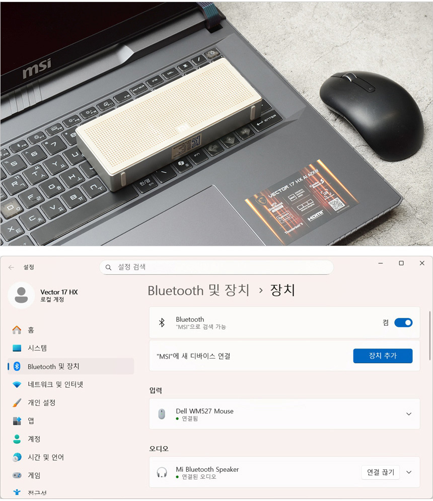 블루투스를 지원해 다양한 액세서리를 무선으로 연결해 사용할 수 있다. 상단의 사진은 스피커와 마우스의 연결 모습으로 빠르게 페어링 되는 것을 확인할 수 있었으며 원활하게 작동했다.