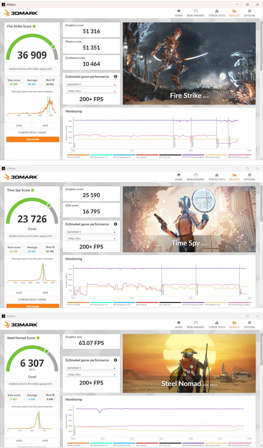 포르자 호라이즌 5를 최고 옵션으로 설정해 실행한 모습으로 QHD+ 해상도에서도 100 프레임 후반대의 높은 성능을 보여주었다. DLSS를 적용하면 300 프레임에 육박하는 높은 성능을 보여주어 더 부드럽게 게임을 즐길 수 있다.