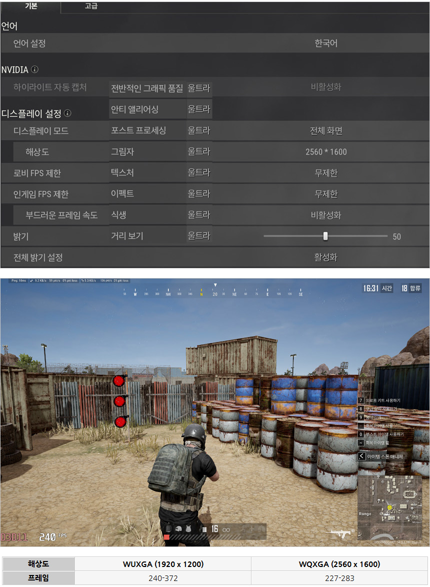 오버워치2를 이용해 게임 테스트를 진행하고 있는 모습으로 최상 옵션을 설정했을 때 QHD+ 기준 300프레임 대로 게임이 가능하다. 풀옵션에서도 240Hz 주사율을 활용하는데 전혀 문제가 없다.