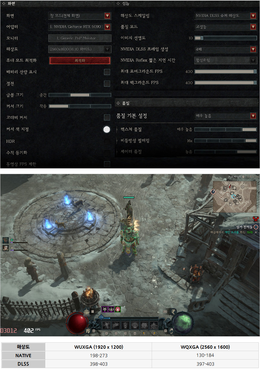 디아블로 4를 매우 높음 옵션으로 플레이 하고 있는 모습으로 DLSS를 사용하지 않고 충분히 게임을 즐길 수 있다. 단, DLSS를 활성화 하면 프레임이 확연하게 높아지기 때문에 DLSS를 사용하고 프레임을 생성해 게임을 즐기기 바란다.