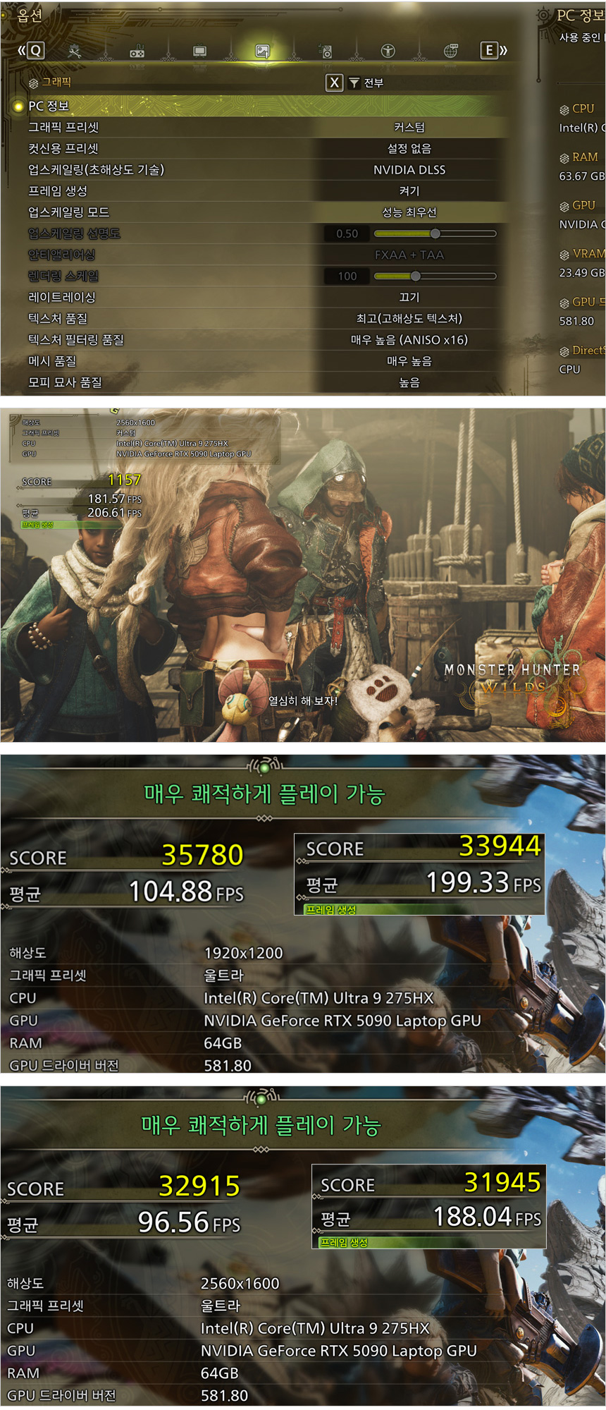 몬스터 헌터 와일드 벤치마크를 울트라 옵션으로 실행한 모습으로 해상도별 프레임 차이는 크지 않은 것을 확인할 수 있다. DLSS를 활용하면 프레임이 대폭 상승하기 때문에 꼭 DLSS를 활성화 해 게임을 즐기기 바란다.