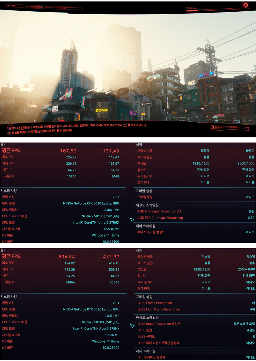 사이버펑크 2077의 벤치마크를 울트라 옵션에서 실행한 모습으로 QHD+ 해상도 에서도 130프레임 까지 나와 부드럽게 게임을 즐길 수 있다. DLSS를 활성화 하면 500프레임에 육박할 정도로 높은 프레임을 보여주어 더 쾌적하게 게임을 즐길 수 있다.