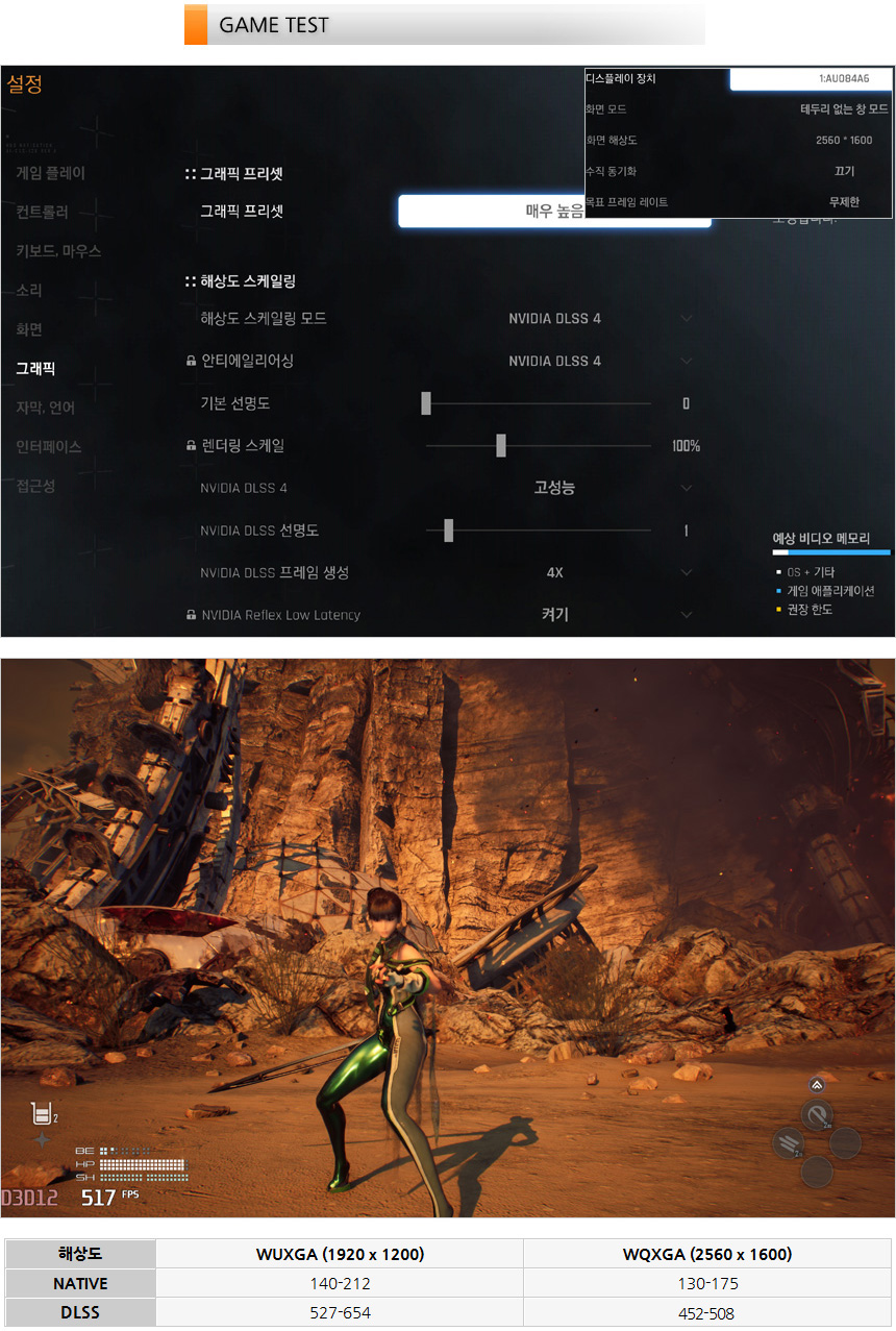 스텔라 블레이드를 플레이 하고 있는 모습으로 DLSS를 사용하지 않아도 부드럽게 플레이 할 수 있다. DLSS를 활성화 하면 QHD+ 에서도 400프레임 이상을 확보할 수 있어 부드럽게 게임을 플레이 할 수 있다. (DLSS 의 경우 프레임 생성을 4X로 설정했다.)