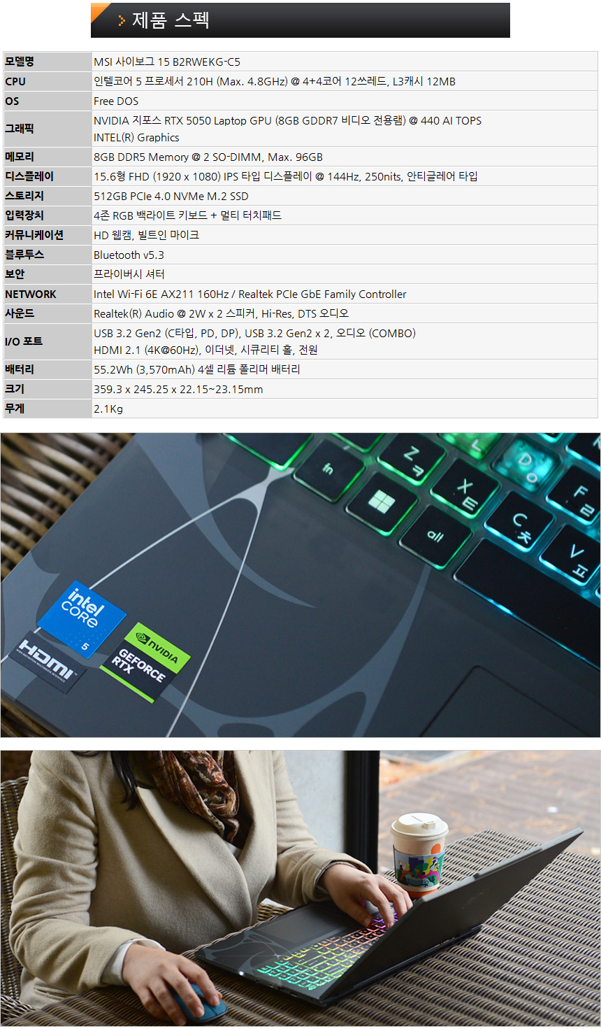 또한 기가비트 유선랜을 비롯해 인텔 Wi-Fi 6E 무선랜을 지원해 사용성을 높였으며 HD 웹캠이 장착되어 화상회의나 게임방송에서 유용하게 활용할 수 있다. (RTX 5050 외장그래픽은 8GB 의 비디오 전용램을 제공하며 1500MHz 의 부스트 클럭으로 작동한다.)
