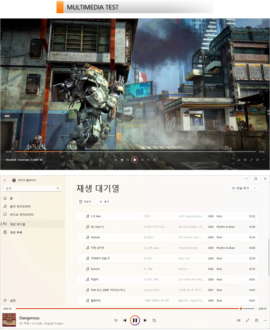 4K 동영상을 이용해 멀티미디어 테스트를 진행하고 있는 모습으로 15.6형 대화면에 슬림 베젤 적용으로 탁 트인 시야감을 경험할 수 있었으며 IPS 패널 특유의 선명함도 인상적이었다. 또한 MP3 파일을 이용해 스피커의 사운드를 했는데 사무실을 가득 울리는 시원한 소리를 들을 수 있었으며 중고음과 저음간의 밸런스도 상당히 좋은 편으로 자극적이지 않고 깔끔한 사운드를 들려 주었다. 특히 DTS 오디오에서 다양한 프로파일을 지원해 손쉽게 자신에 맞는 음색을 설정할 수 있다.