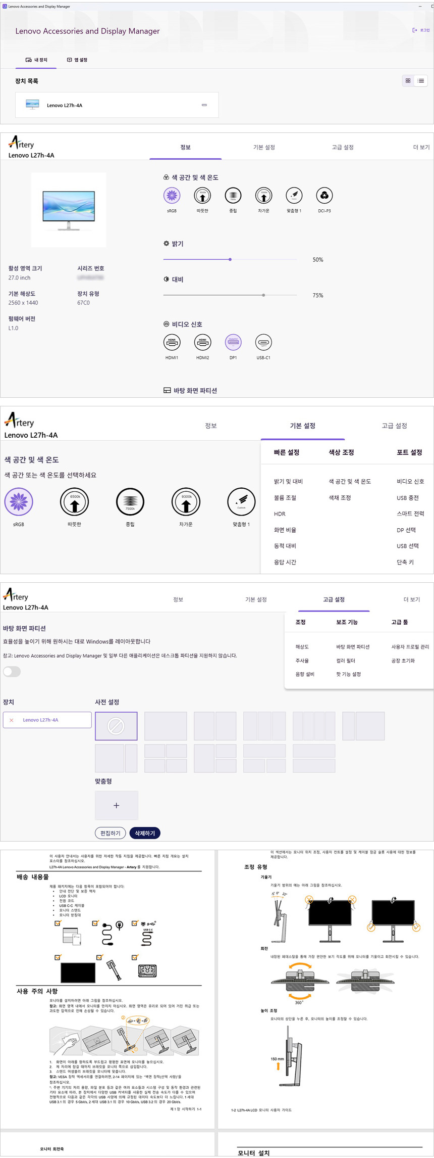레노버 모니터는 전용 S/W를 제공해 PC를 이용해 모니터를 컨트롤 할 수 있다. 상단의 사진은 레노버 디스플레이 컨트롤 센터를 실행한 모습으로 시스템 정보가 표시되며 밝기와 명암비, 색온도 등을 빠르게 조정할 수 있다. 기본기능과 고급기능으로 구분되며 OSD에서 지원하는 기능 뿐만 아니라 윈도우 디스플레이 설정도 제공해 편하게 모니터를 사용자에 맞게 셋팅할 수 있었다. 또한 사용설명서도 확인할 수 있다. (자세한 사항은 동영상을 참조하기 바란다.)