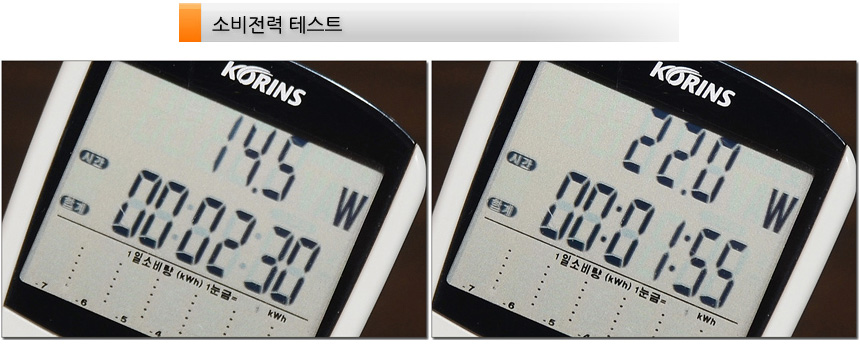 소비전력 테스트를 진행하고 있는 모습으로 100% 밝기에서 22W, 50% 밝기에서 14.5W 의 소비전력을 보여주었다. (대기에서는 0.5W를 유지한다.) 전기세 걱정없이 사용할 수 있을 것이다. (QHD 해상도에 100Hz 주사율을 지원해 100% 밝기에서 30W 정도로 작동할거라 예상했는데 기대 이상의 저전력으로 작동했다.)