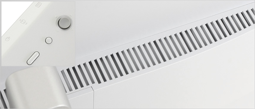 모니터 후면부의 모습으로 중앙에 통풍구가 설티되어 있고 측면에는 OSD 설정을 위한 조그버튼과 전원 버튼이 설치되어 있다. (버튼이 나열된 제품들 대비 직관성이 뛰어나 편하게 기능을 조정할 수 있었다.)