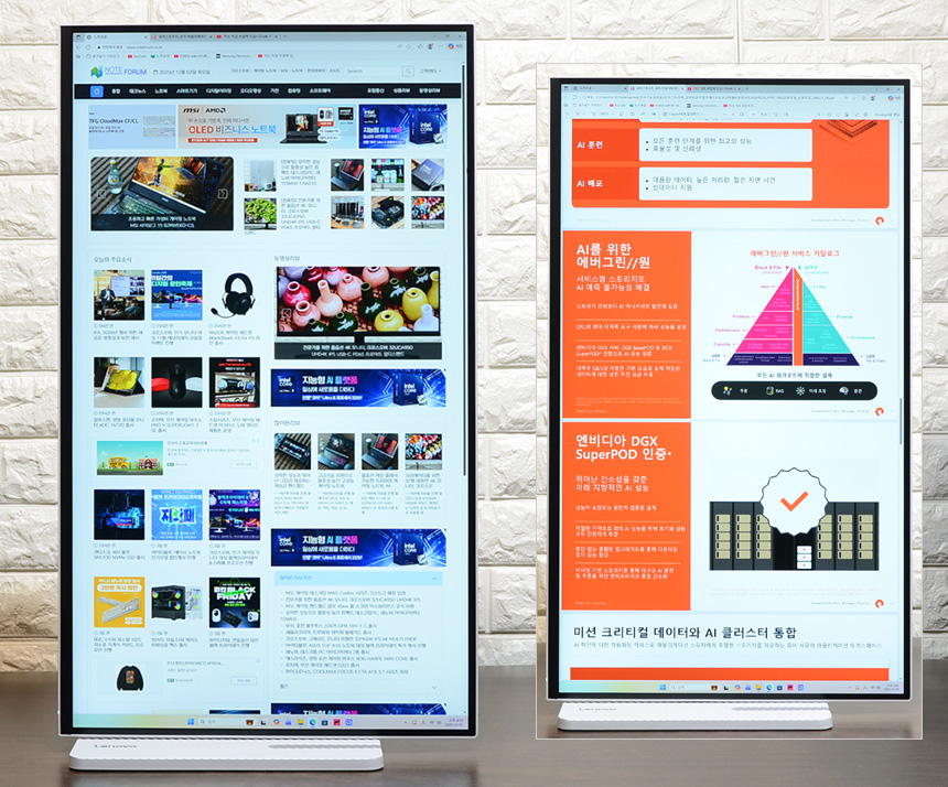 이 제품은 멀티스탠드가 장착되어 있고 피벗모드를 지원한다. 사진과 같이 문서나 PPT 자료를 손쉽게 확인할 수 있으며 DTP (전자출판) 용도로 활용할 수 있다. 또한 세로직캠 영상을 즐기는 용도로도 활용할 수 있다. (최근 세로영상이 늘어나는 추세이기 때문에 유용하게 사용할 수 있을 것이다.)